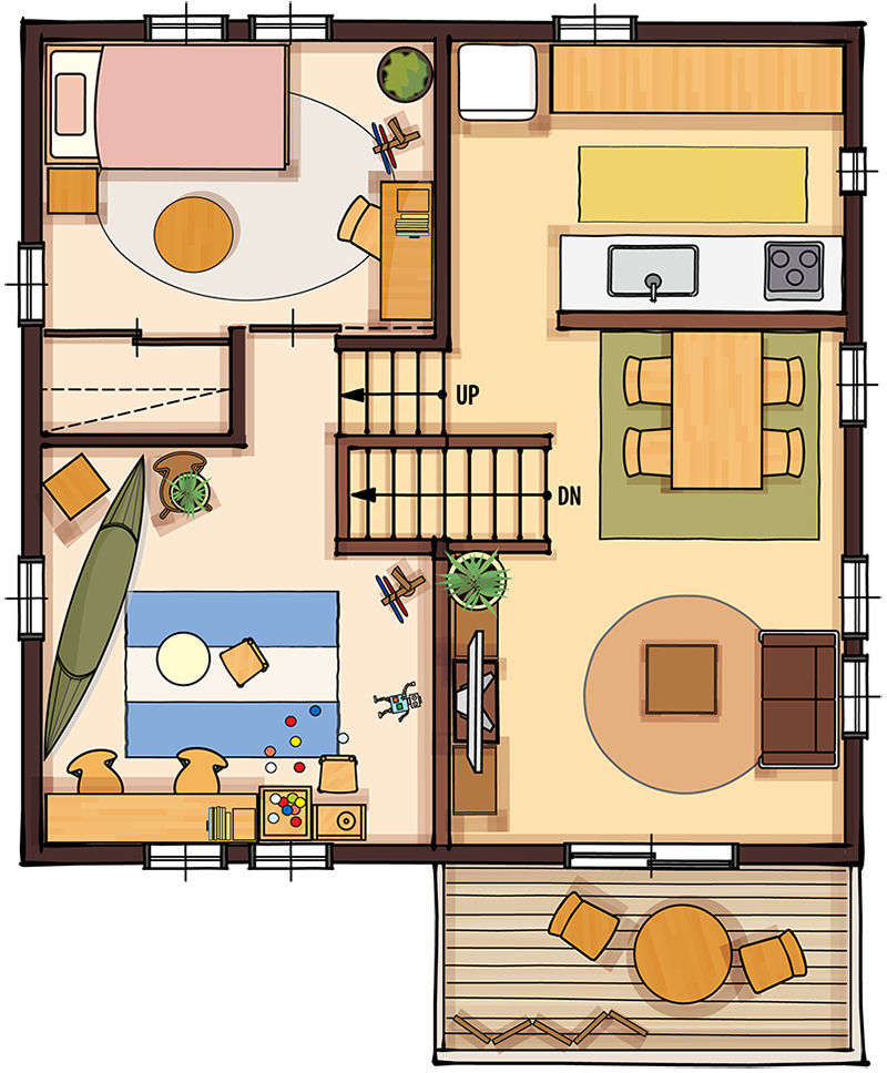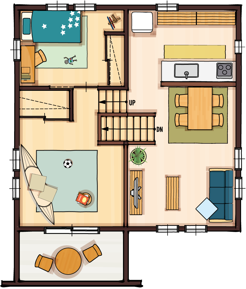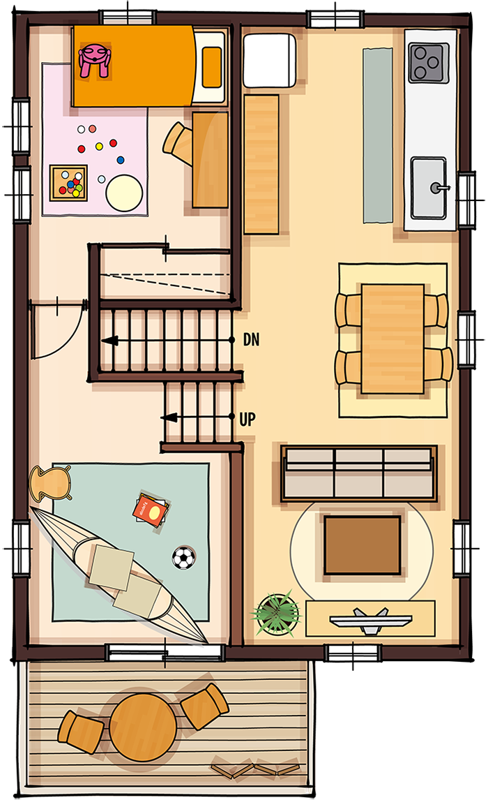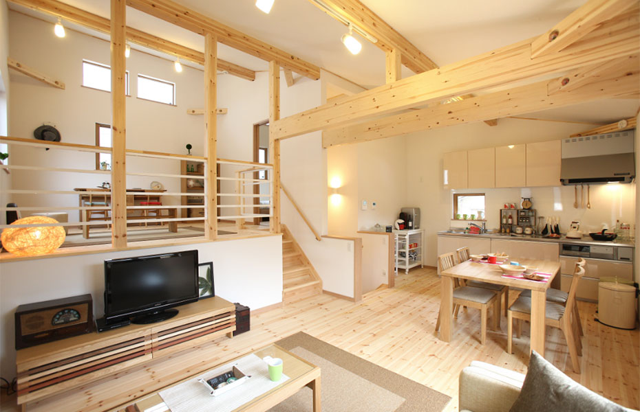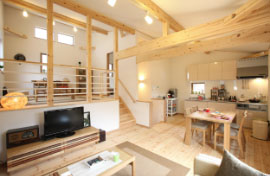1.5階にあるLDKは、フリースペースとウッドバルコニーにつながる大空間。