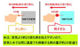 たとえば、100℃のお湯に触ると一瞬で火傷するけど、100℃の空気ならしばらく大丈夫。