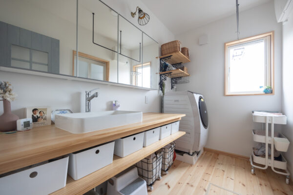 並んで身支度できるように広くとったスペースは、収納や洗濯スペースに活用できています♪